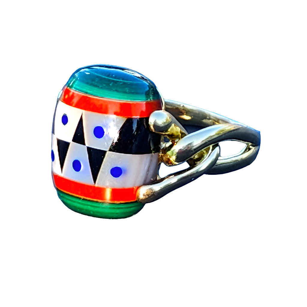 Crafted with 14k yellow gold, this Asch Grossbardt ring features inlays of lapis, coral, onyx, and malachite. A luxurious addition to any jewelry collection, this ring boasts intricate detail and rich colors. Elevate your style and make a statement with this stunning gold inlay ring.size 7