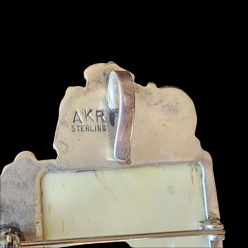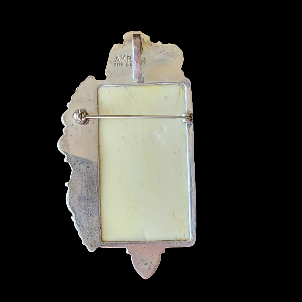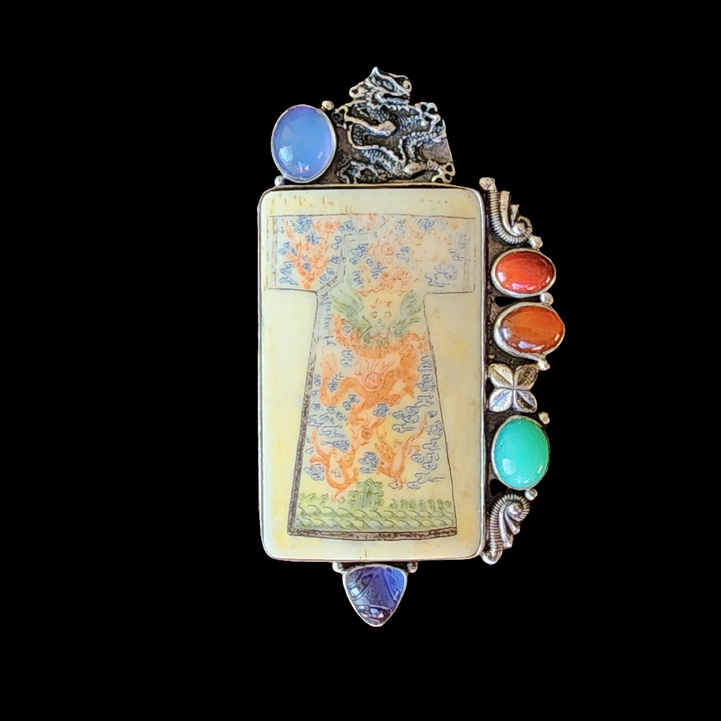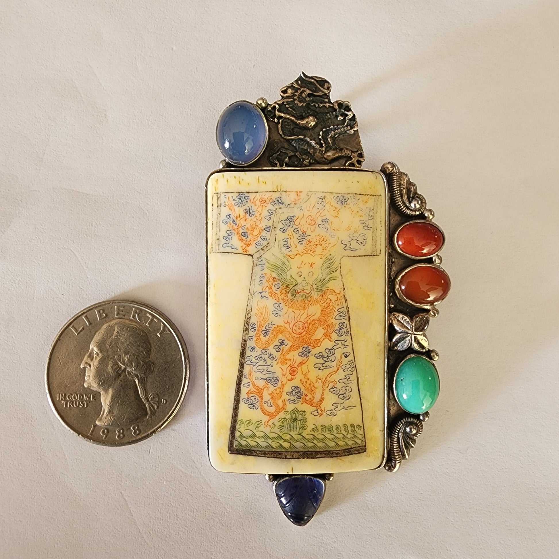 you are getting a Sterling silver vintage pendent brooch by AKR (Amy Kahn Russell ) it has multi stones.The bottom has a cool design on the blue stone, there is a little dragon by the top of brooch, the shirt looks to be organic (bone or ivory) quarter is for size