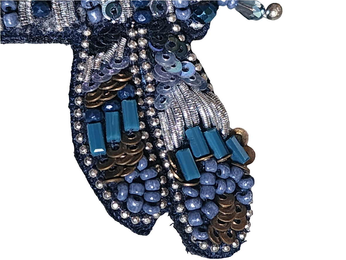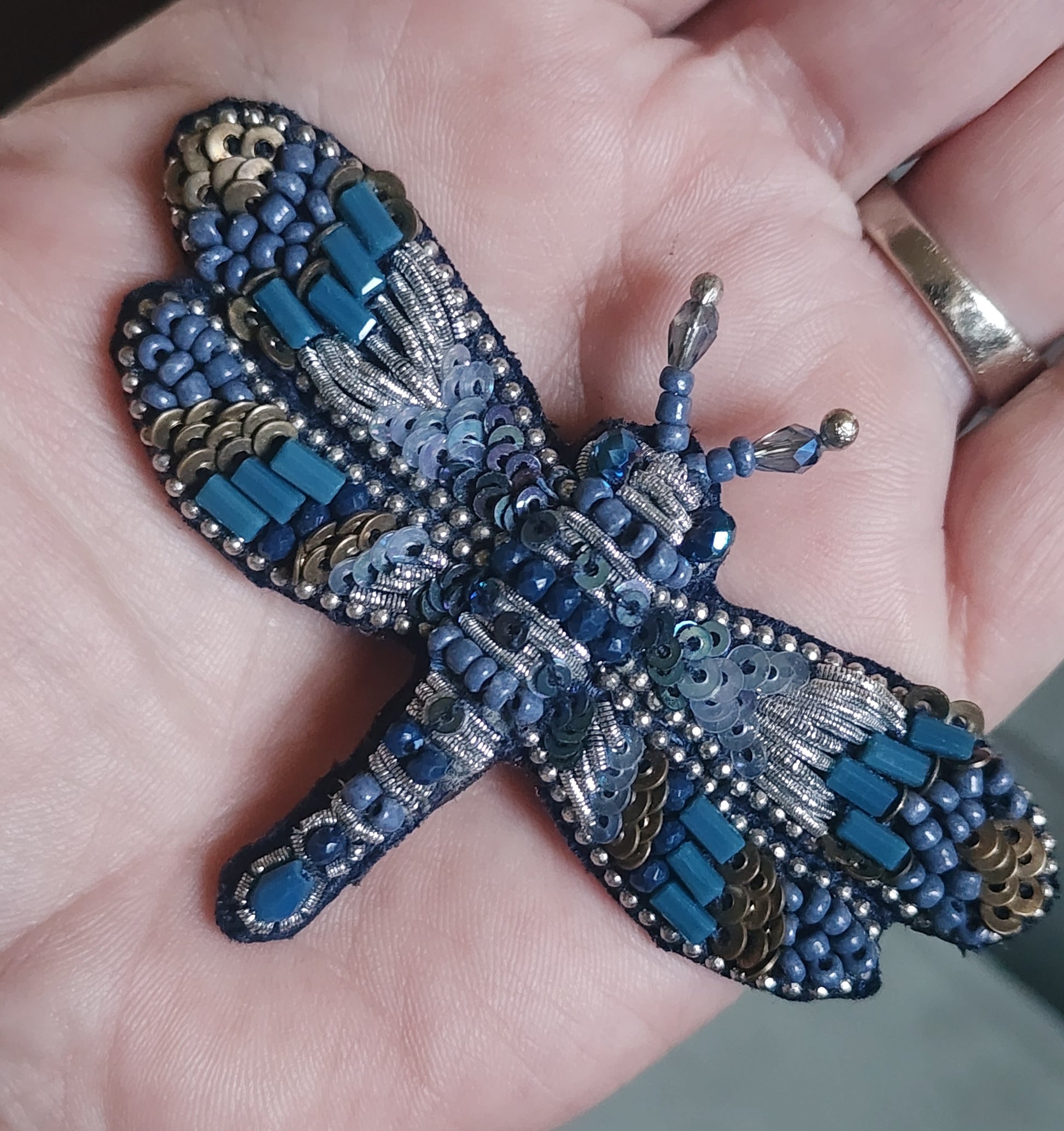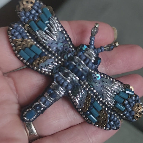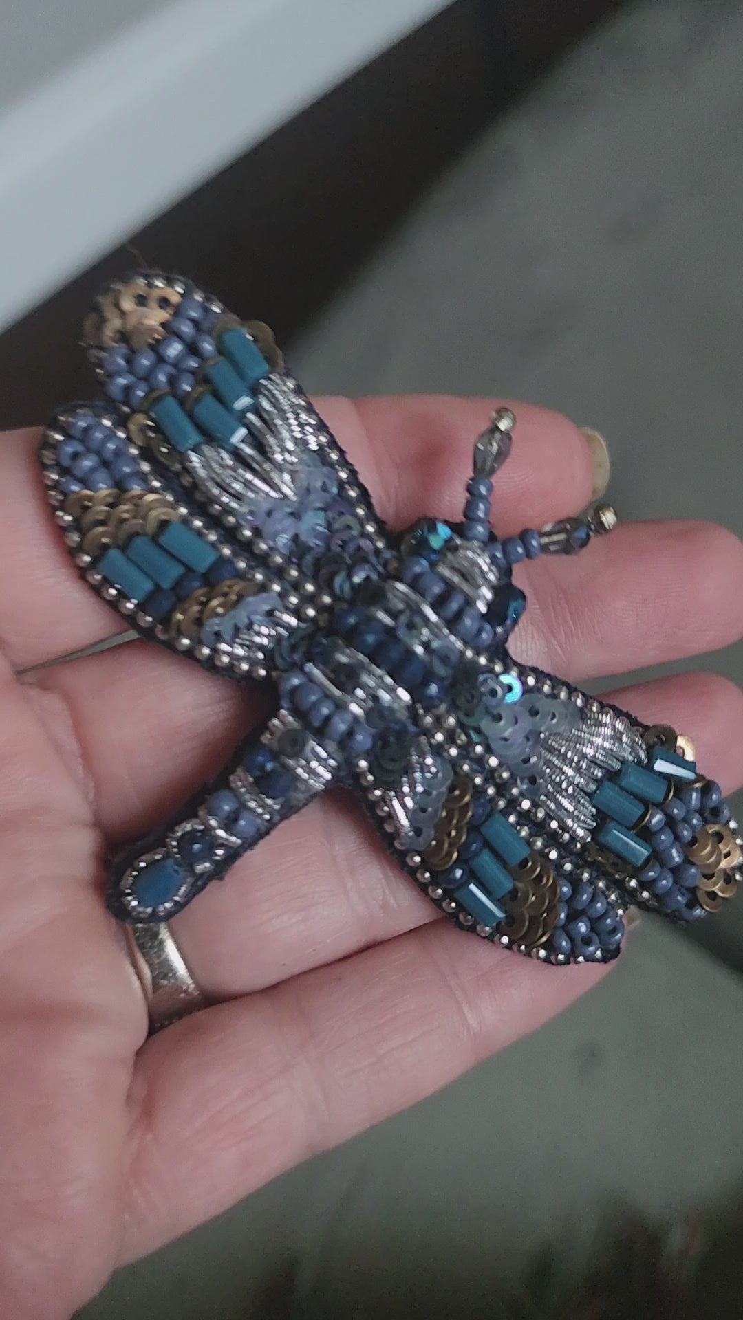 Expertly crafted with intricate embroidery, this handmade dragonfly pin brooch adds a touch of elegance to any outfit. Made with stunning blue tones, it is a unique and stylish accessory. Elevate your look with this delicate yet eye-catching dragonfly pin.