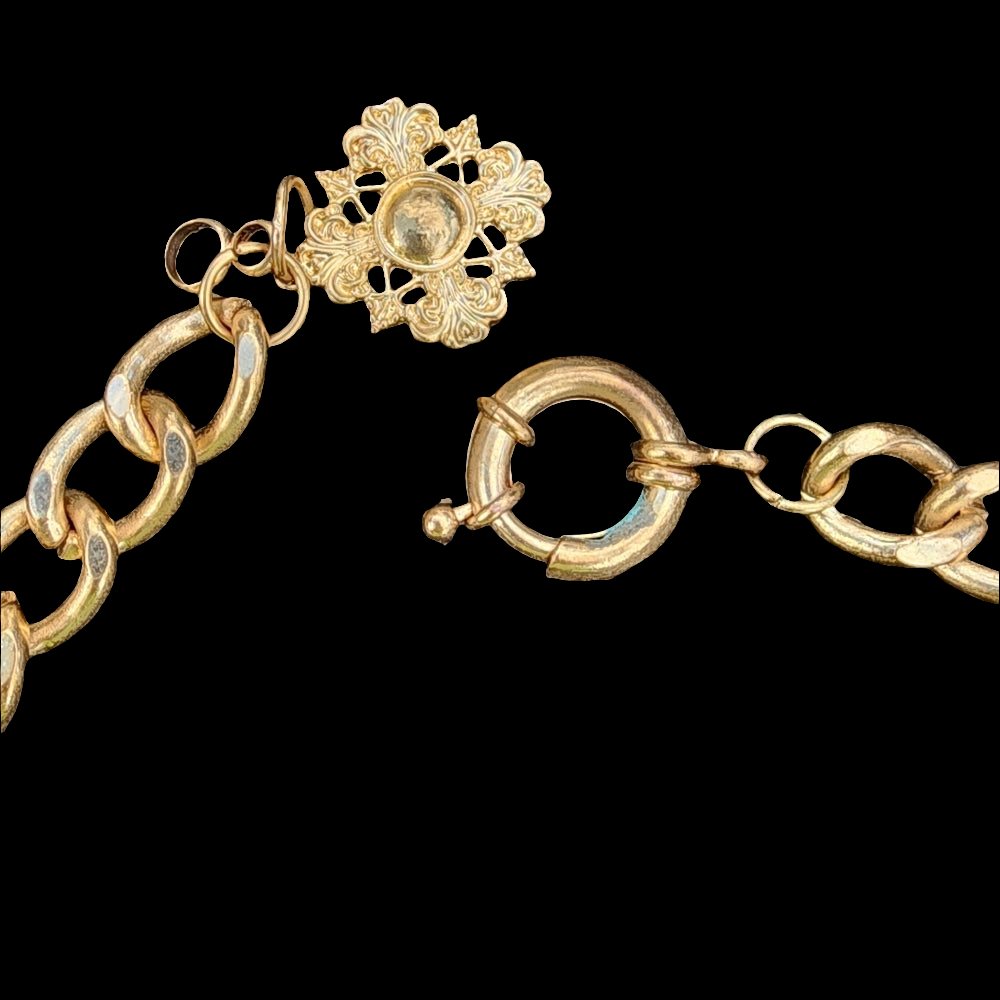 this is a heck of a necklace, it my even be a bracelet, I've never see anything like this. you will stand out for sure. gold tone art nouveau style with acrylic blue and turquoise color.