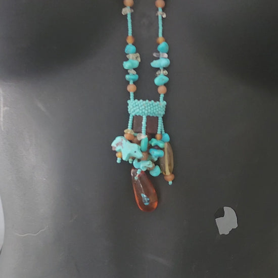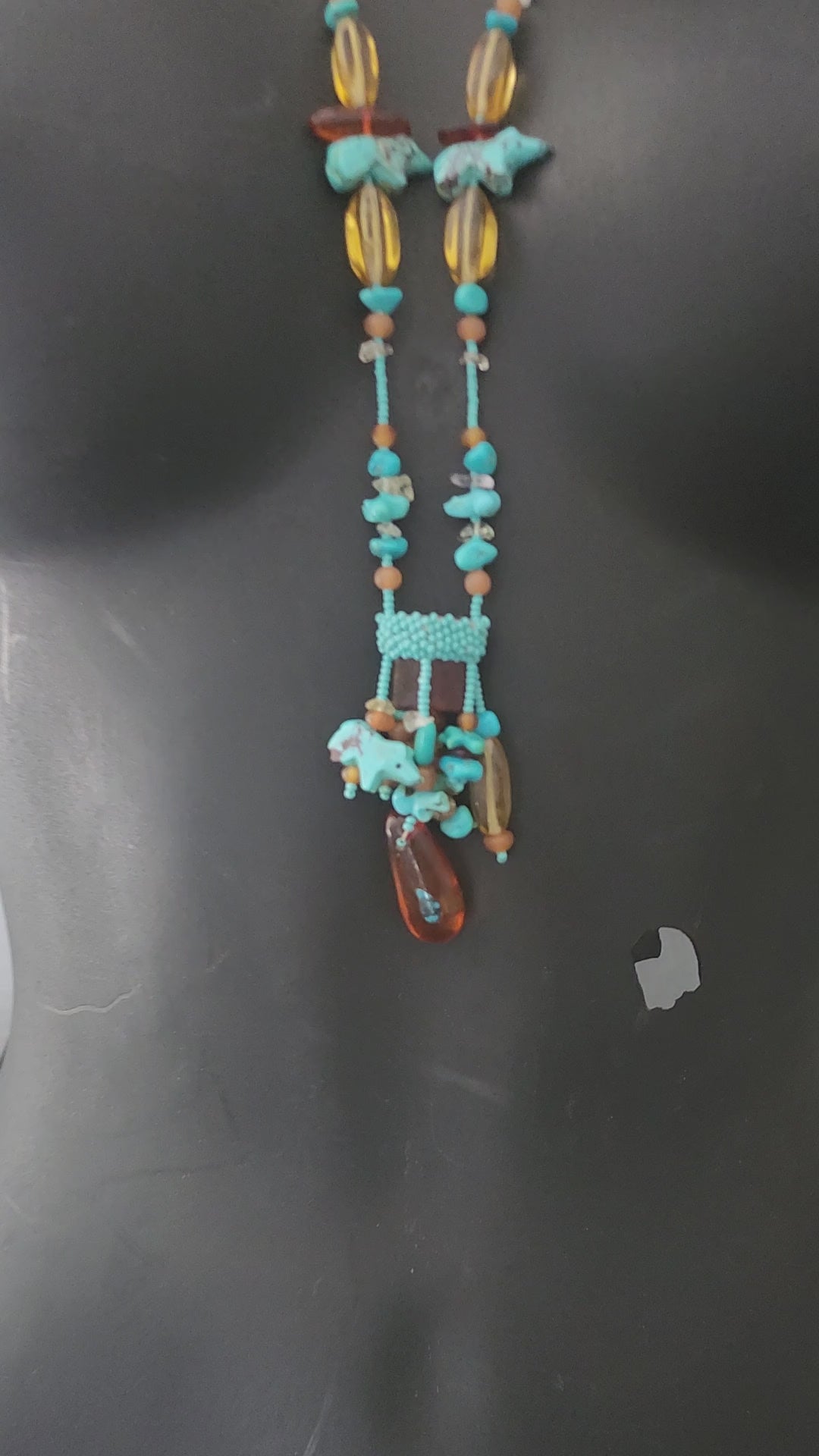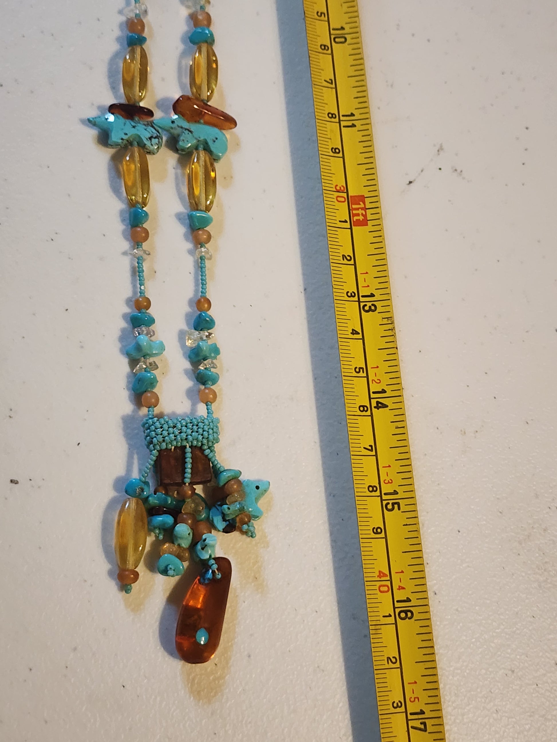 "Experience the spirit of Native American culture with our handmade seed bead necklace featuring fetish bears turquoise. Embrace the luxurious and exclusive beauty of this tribal-inspired piece, crafted to elevate your style and add a touch of sophistication to any outfit."