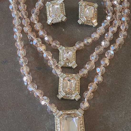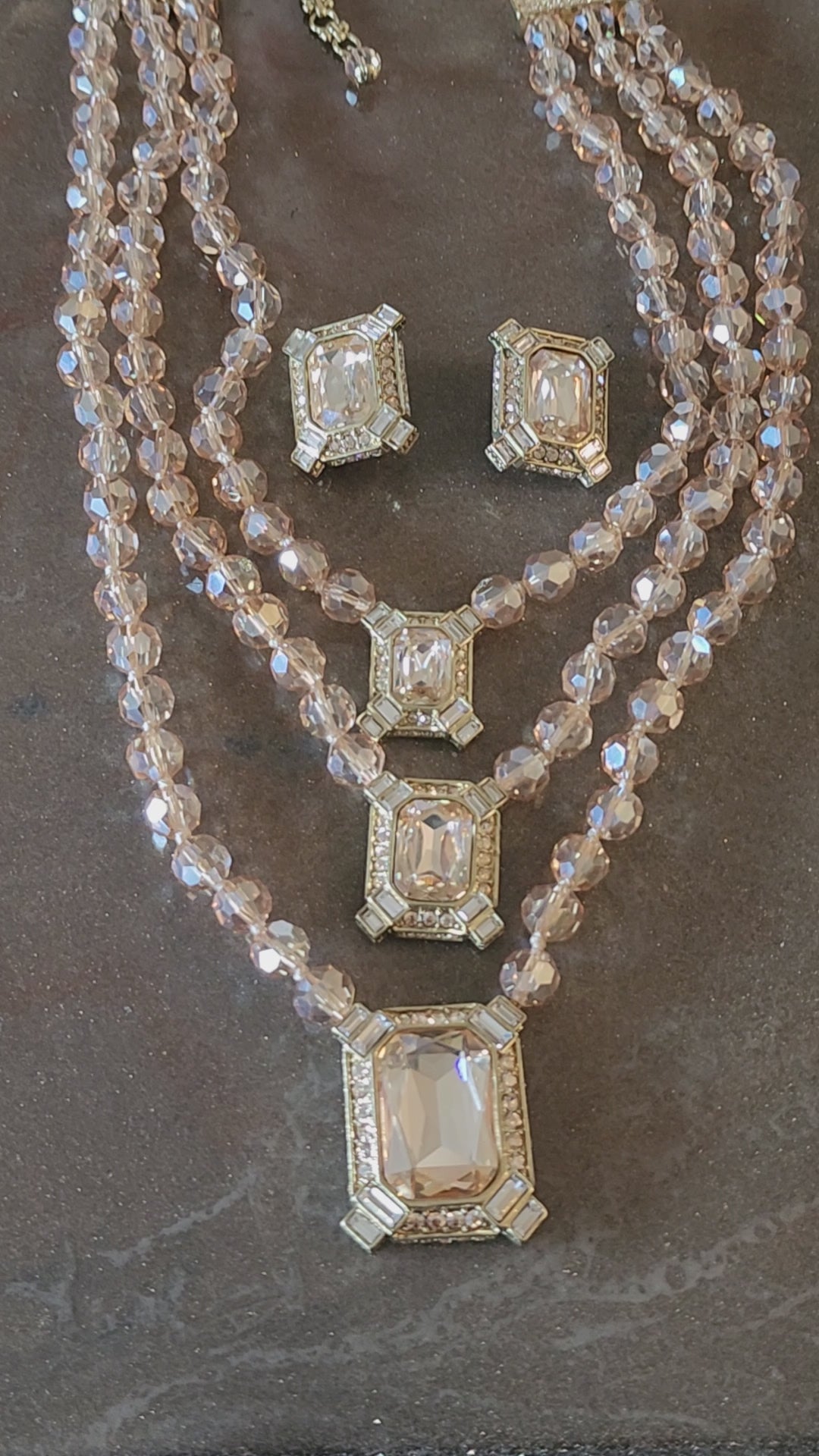 Heidi Daus golden crystals three strand necklace and clip on earrings set