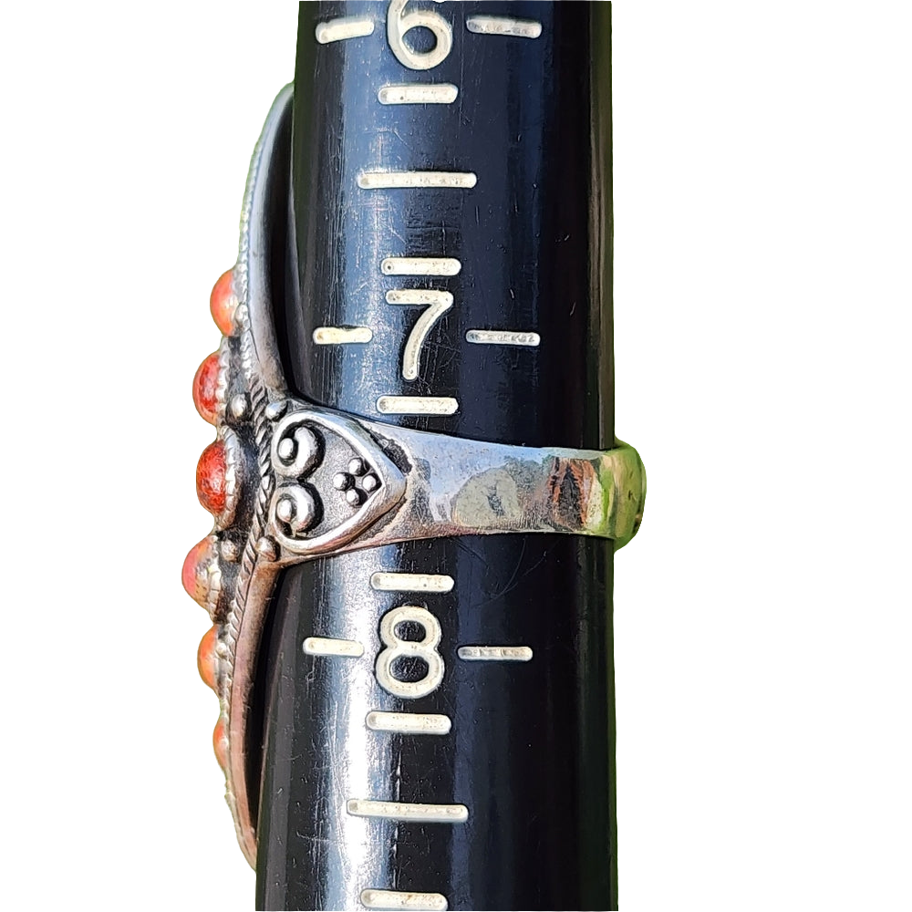 I present to you our Huge Chunky Sterling Silver Red Coral Ring. Handcrafted with sterling silver, this ring is a size 7.5 and features a stunning red coral centerpiece. With its boho and Southwestern influence, this ring is sure to make a statement and add a touch of elegance to any outfit. Own a unique piece of jewelry that exudes style and sophistication
