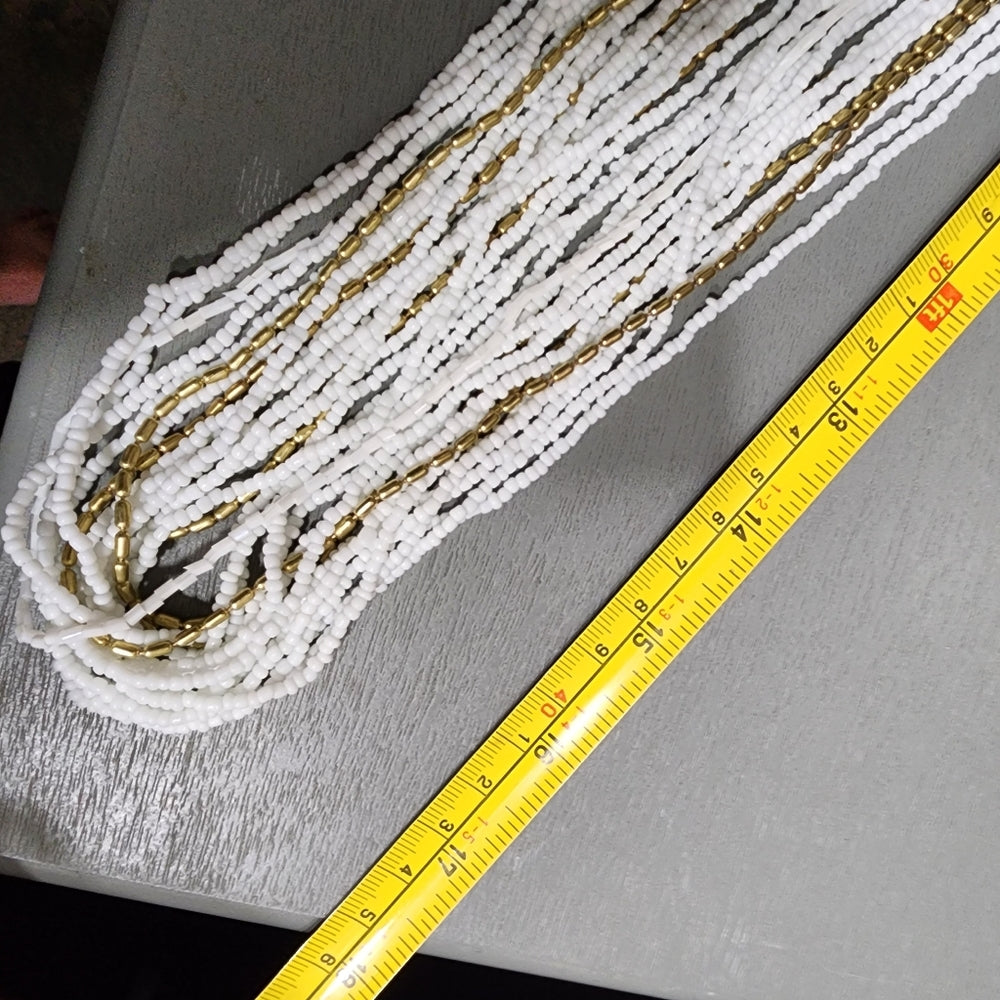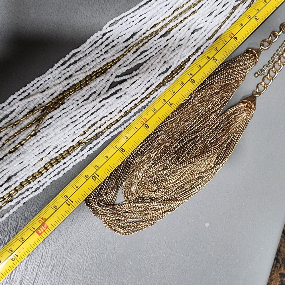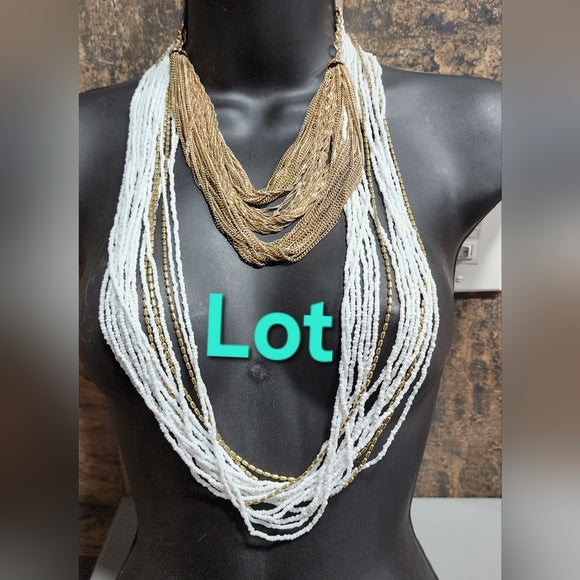 You're buying a lot of jewelry you see in the photos one.As a white glass layered long necklace.The other is chains and it's shorter layered necklace