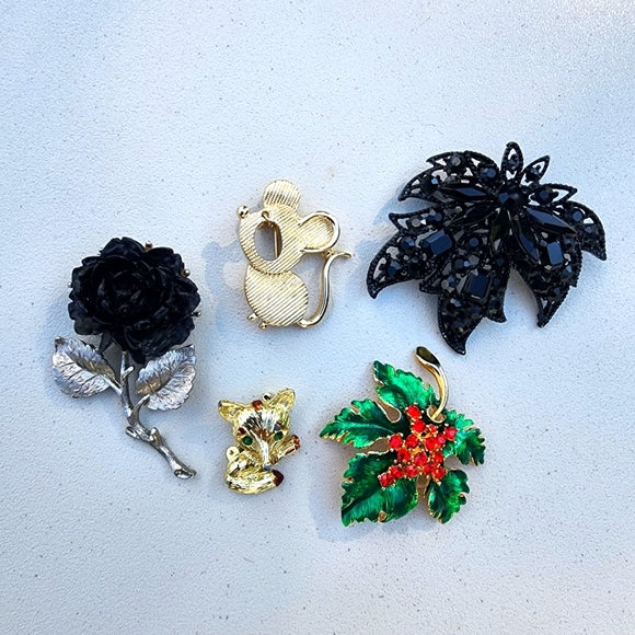 you are getting everything you see in the photo all good wearable condition there is a flower pen and a nemoed rhinestone Leaf pen a black rhinestone Leaf pin a mouse Mark Sarah for Sarah Coventry and a little fox pin by gerrys. if you have questions to ask please check out my other jewelry