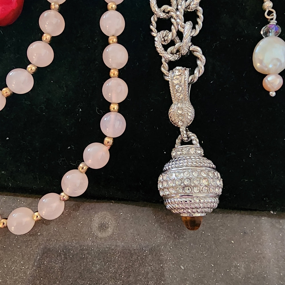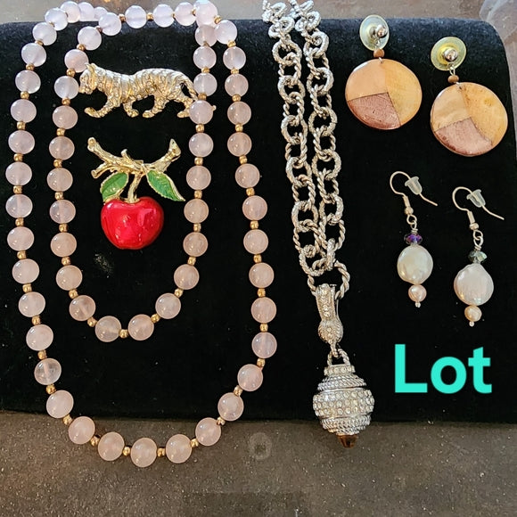 You are getting everything you see in the photo a lot of costumes jury.There are 2 necklaces, 2 pairs of earrings and 2 broaches.The pink necklace is glass beads. I usually do not measure anything in lots. just price them so you can make $ on them.