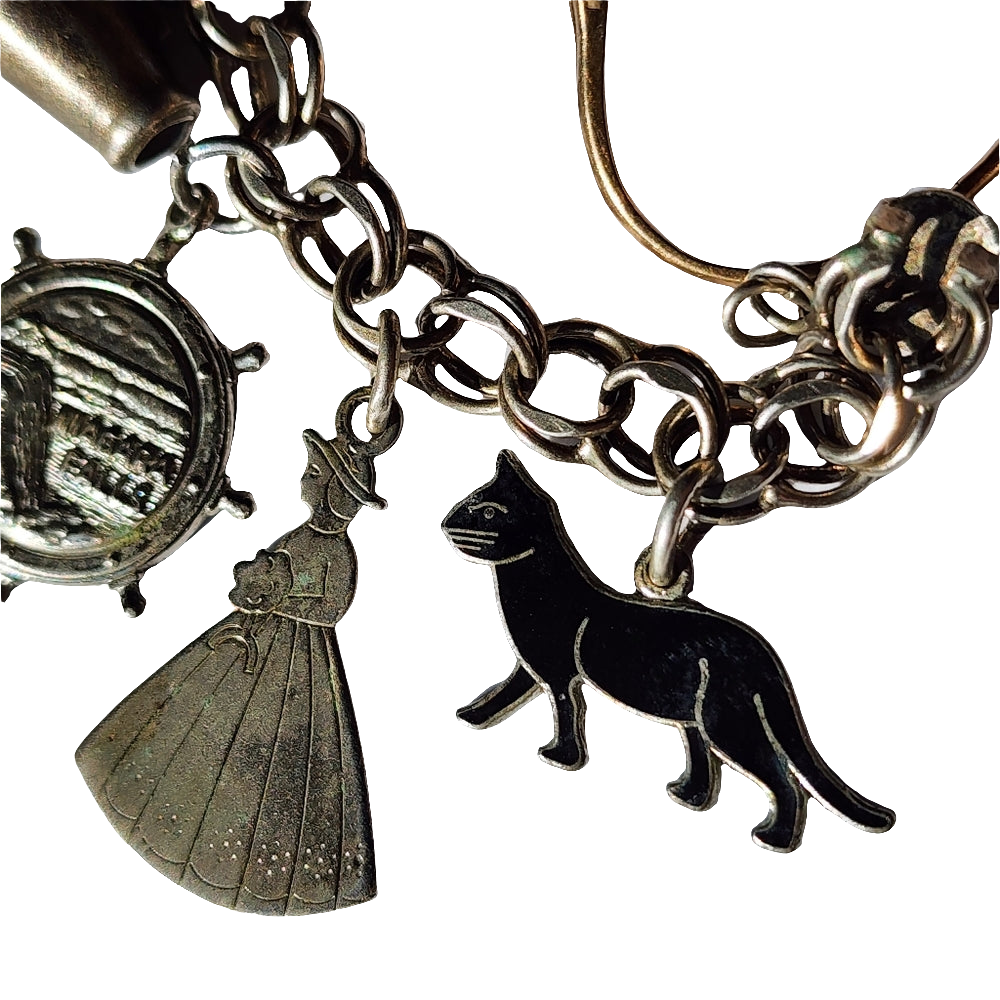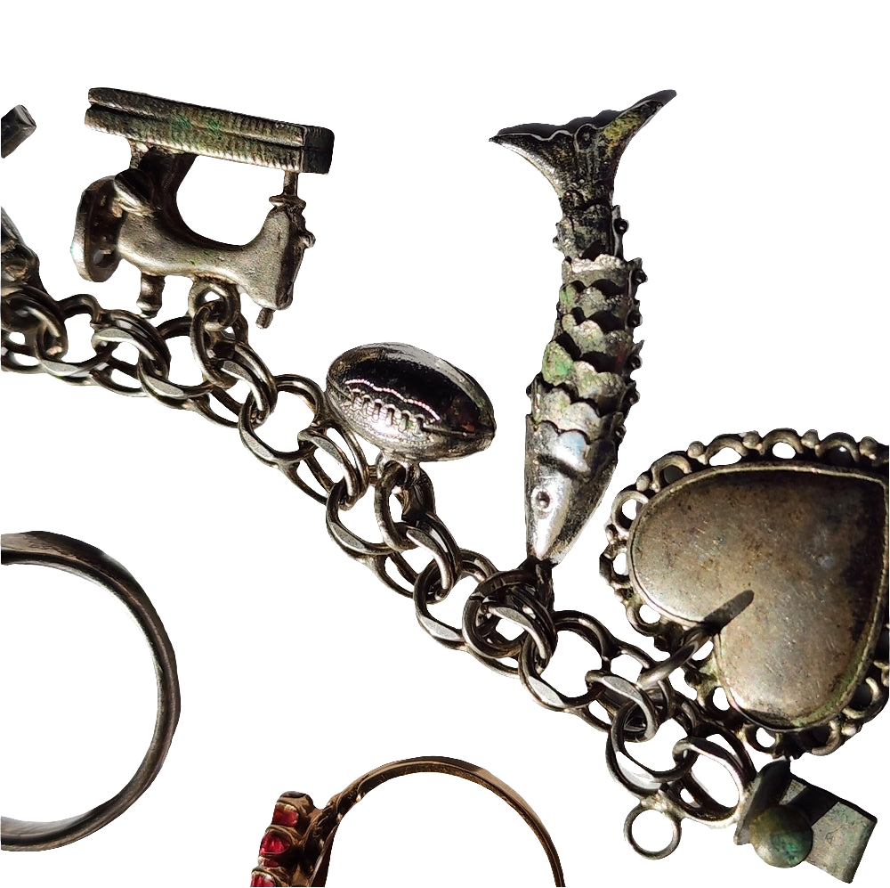 you are getting everything you see in the picture. vintage jewelry there is a sterling silver Danecraft charm bracelet with sterling silver charms they could use cleaned one has a black enamel cat a heart of fish sewing machine cross and other items. Siam silver ring that is size 7.25 you're getting a Native American Motif ring size 4.5 it is sterling silver you are getting a 10 or 14k karat gold ring with black onyx and diamond has a split in the back and a gold tone ring not marked with rubies nice lot of jewelry for wear or scrap. I do not clean any of my jewelry so it may need cleaned