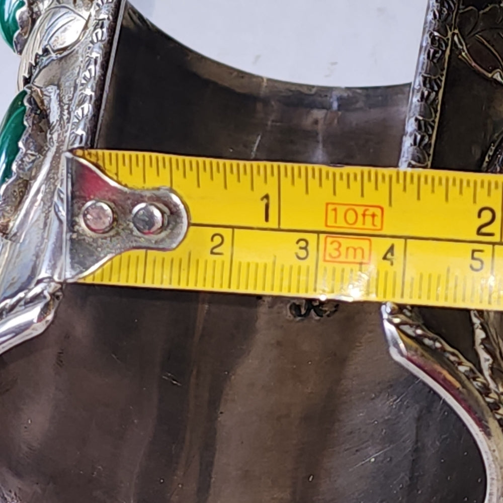 are getting a museum quality unisex sterling silver watch cuff bracelet by Navajo artist Jerry Roan 1919-1977. so I did take the watch out and as you can see in the picture one piece needs soldered back on I really don't think it's a big deal. also I circled the only thing I see on this is one of the malachite stones has a fracture through it please see the picture. this is a fabulous piece great craftsmanships you don't find too many like these. I was an Auctioneer for 30 years and never left empty-handed so I'm getting rid of a lot of my collection to downsize . if you have questions please ask I will do my best to answer them measurements are in the picture. thank you for taking the time to look have a great day.