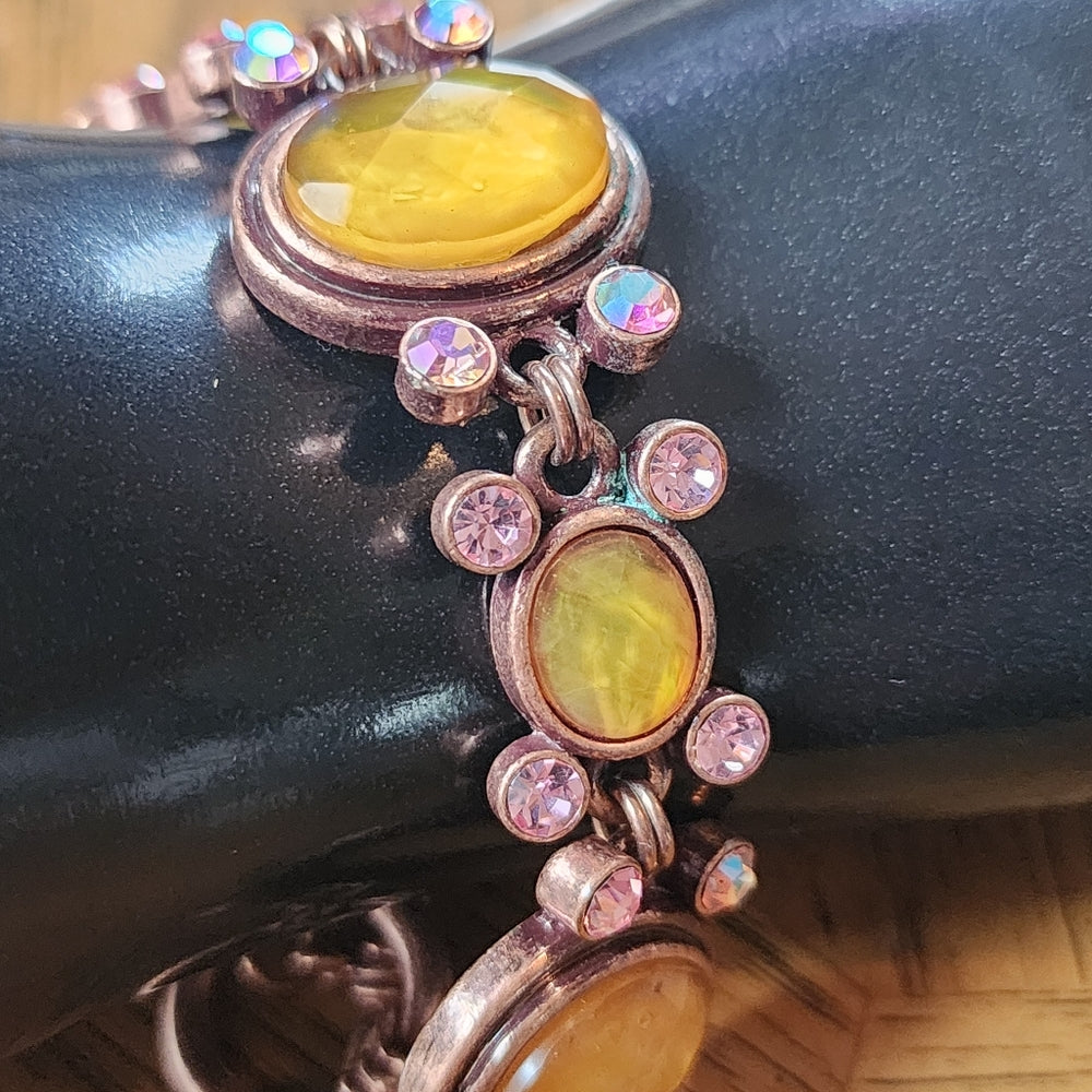 Pink copper Aurora borealis pink and yellow rhinestone link bracelet fashion