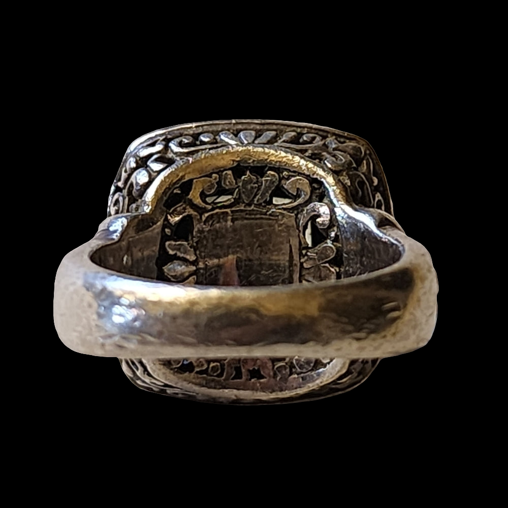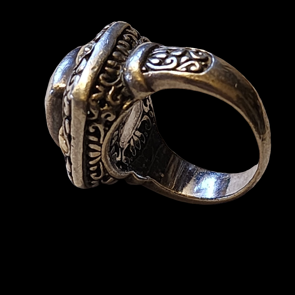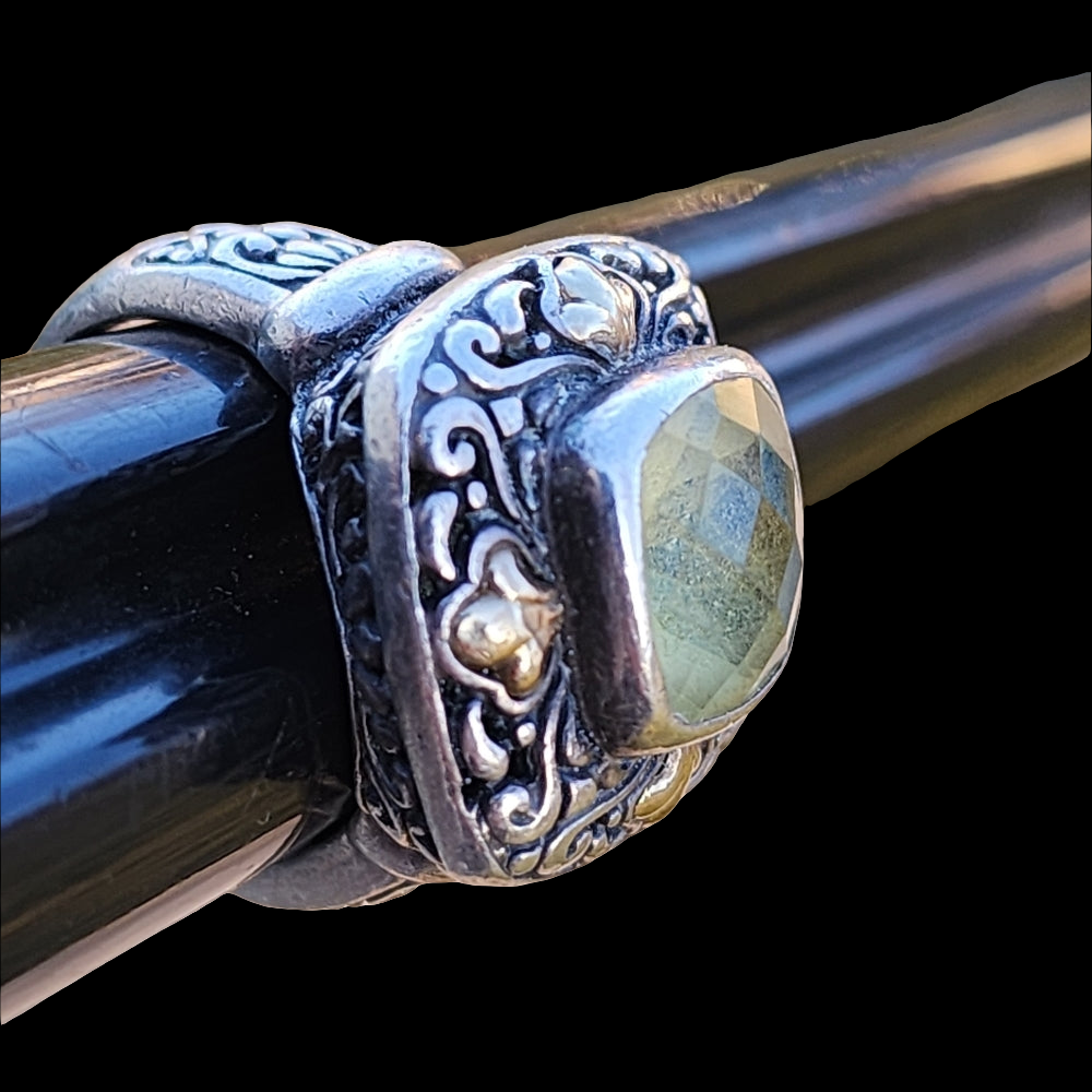 Samuel Benham sterling silver ring with 18 karat gold accents stone is a green Peridot size 6.75. I do not clean any jewelry so it may need cleaned when you get it I test all my pieces and guarantee them to be sterling silver