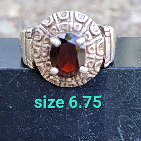 you're getting a nice sterling silver ring with a garnet size 6.75 a test and guarantee you on my jewelry to be sterling silver it is not fake Mark junk or silver overlay. thank you for looking