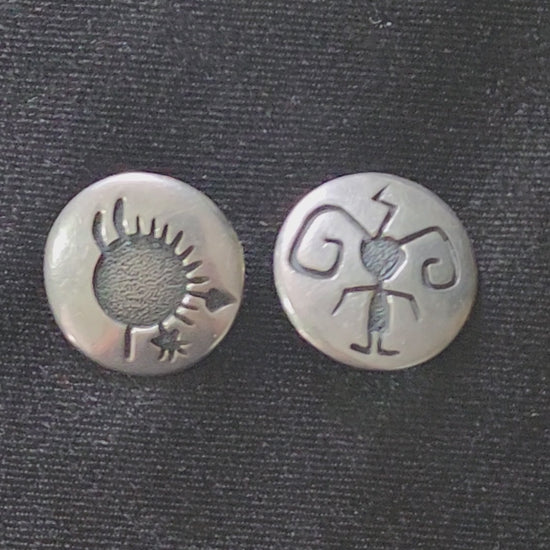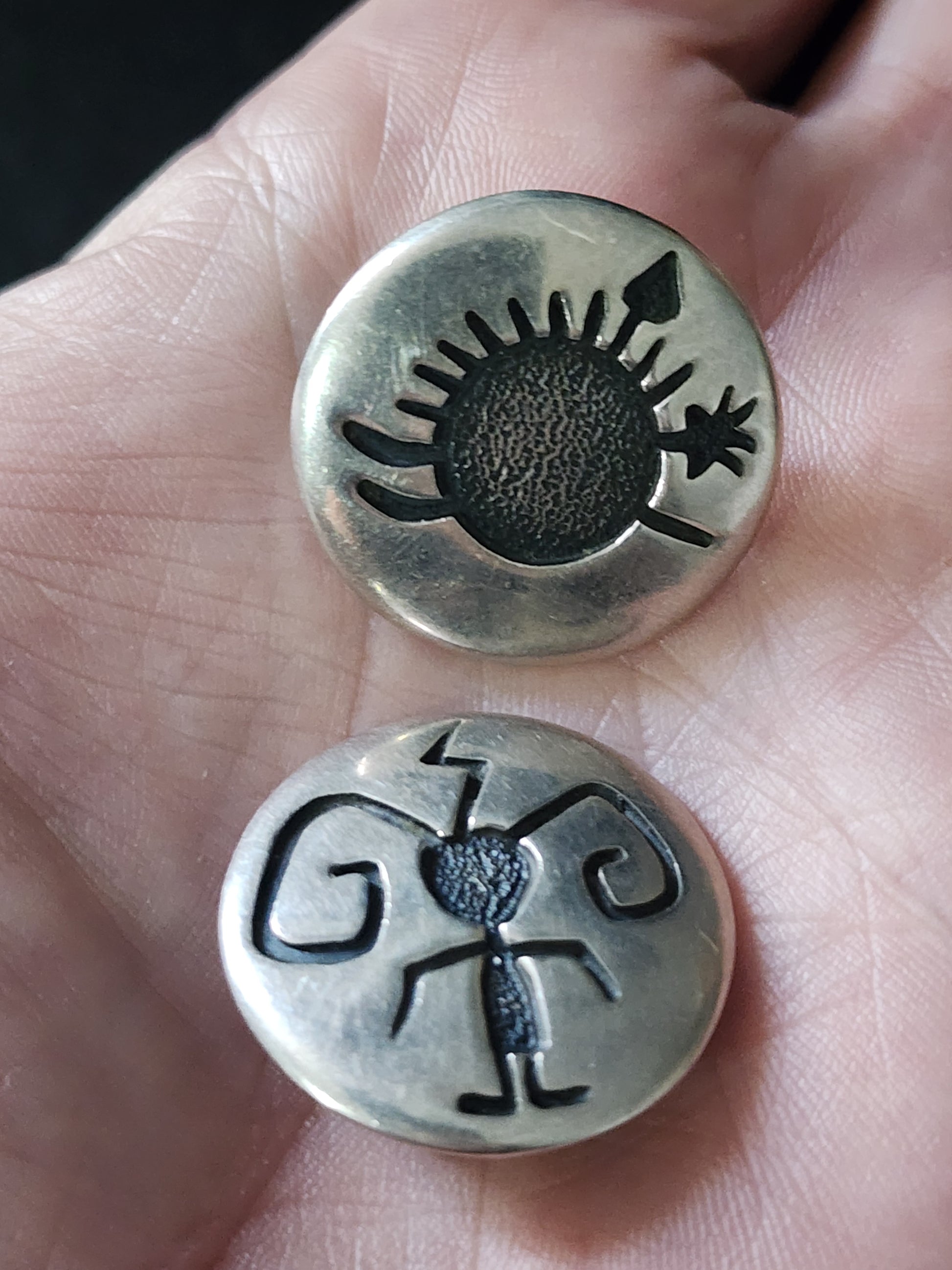 These clip-on earrings by Walt Doran feature a mix of Native American motifs in sterling silver, perfect for adding a touch of culture and style to any outfit. No piercing? No problem! These earrings are a convenient and unique accessory. (Seriously, they're amazing!)