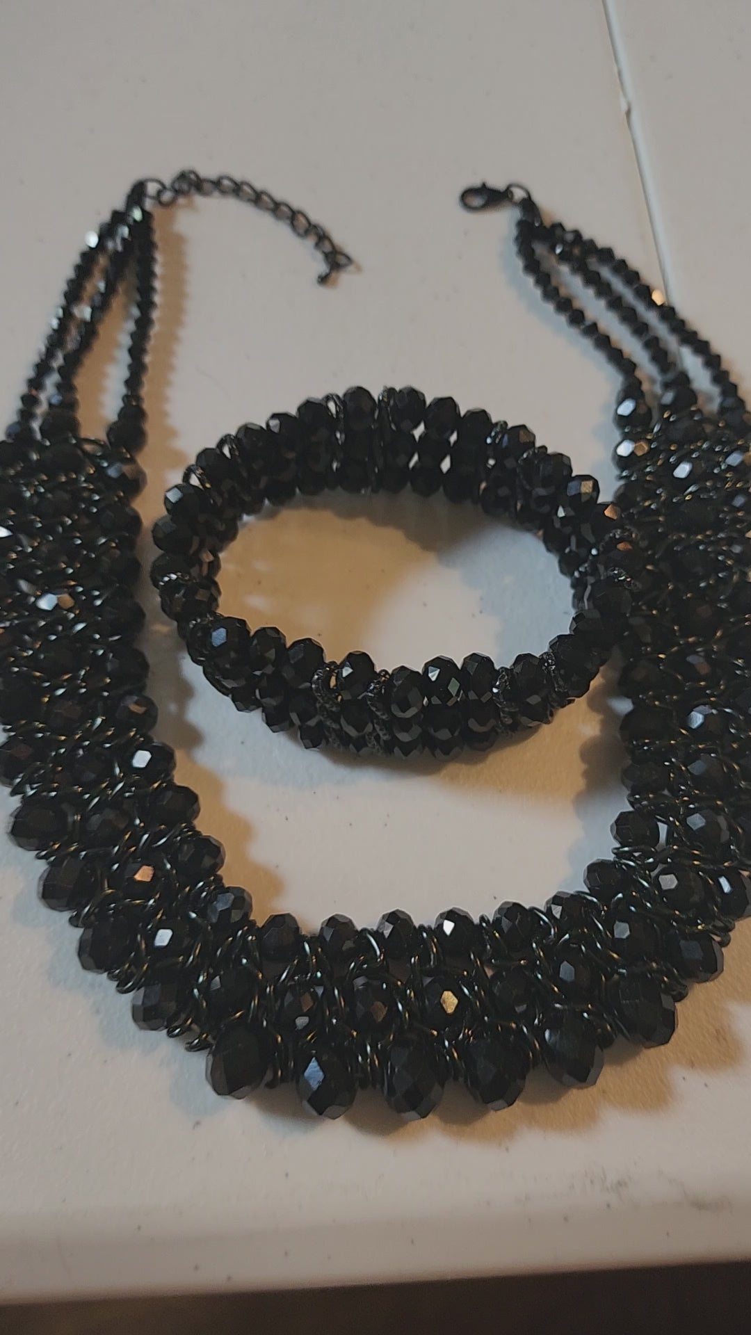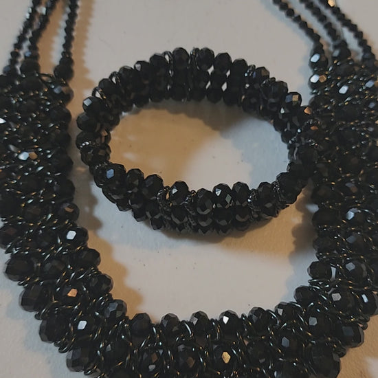 This stunning bracelet and necklace set features faceted glass beads in a sleek jet black hue. The bold and elegant color adds a touch of sophistication to any outfit. Perfect for a night out or a formal event, this set will make a statement and elevate your style.