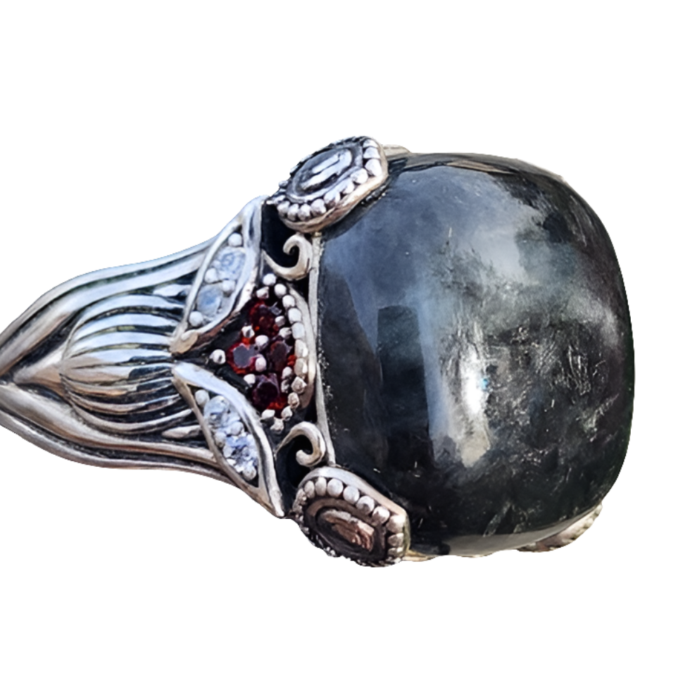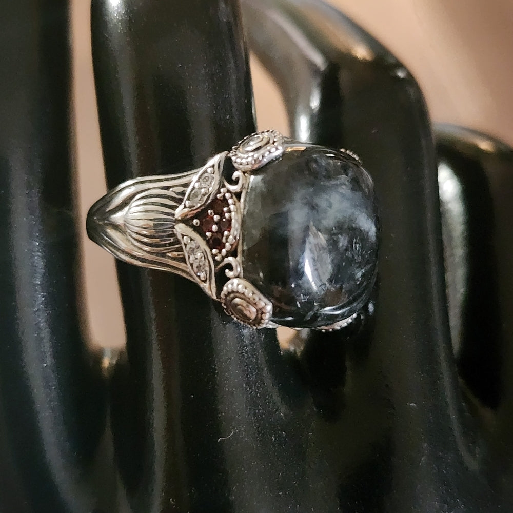 This Vintage Sterling Silver Designer JOY Jewelers diamond ruby ring is a stunning piece of jewelry that will make a statement. The sterling silver adds a touch of elegance and the size 8 floral design add a unique touch. This ring is the perfect addition to any jewelry collection.