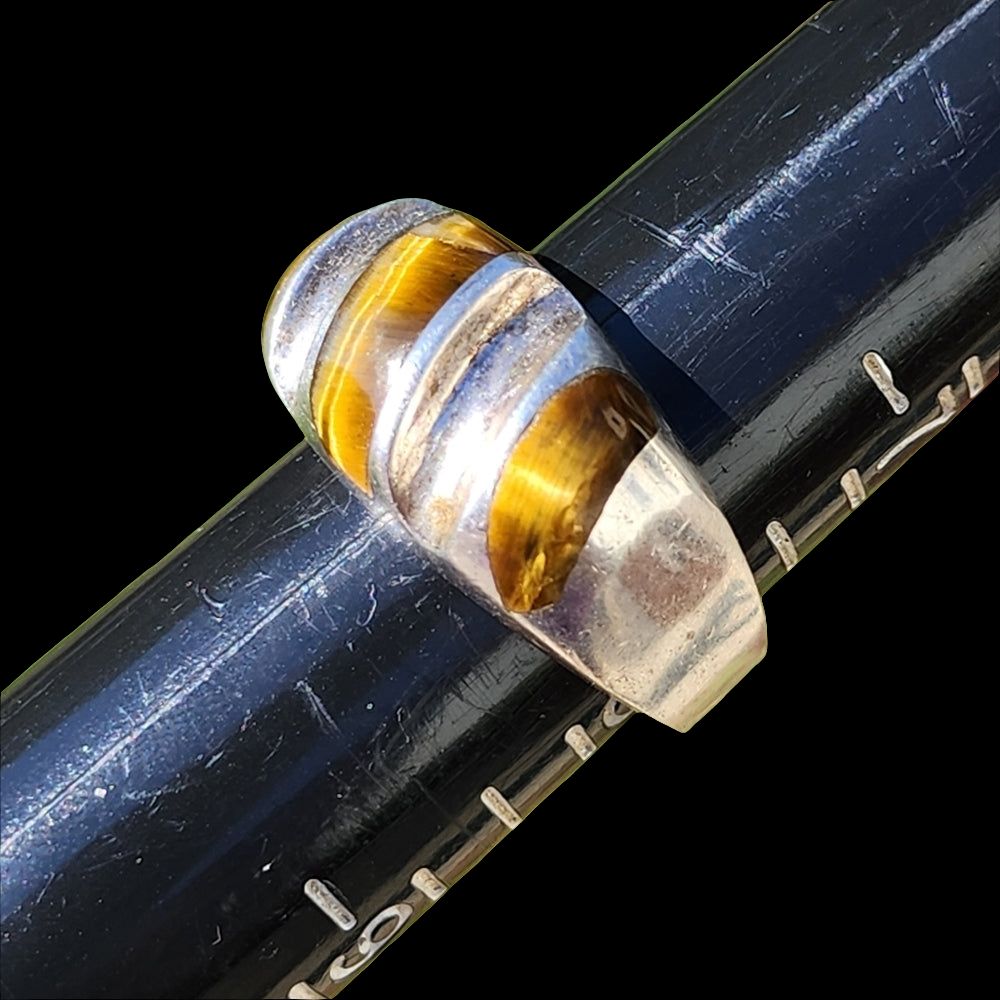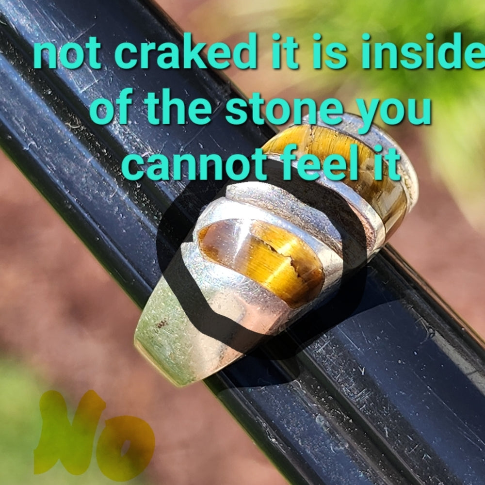 you're getting a beautiful vintage Mexican silver ring is artist signed ATI not familiar with them if you look at the picture I have circled it looks like there's a crack in it but you can run your nail over it and it's smooth so I don't know if it's inside the tiger's eye or just an inclusion. great heavy quality ring size 8